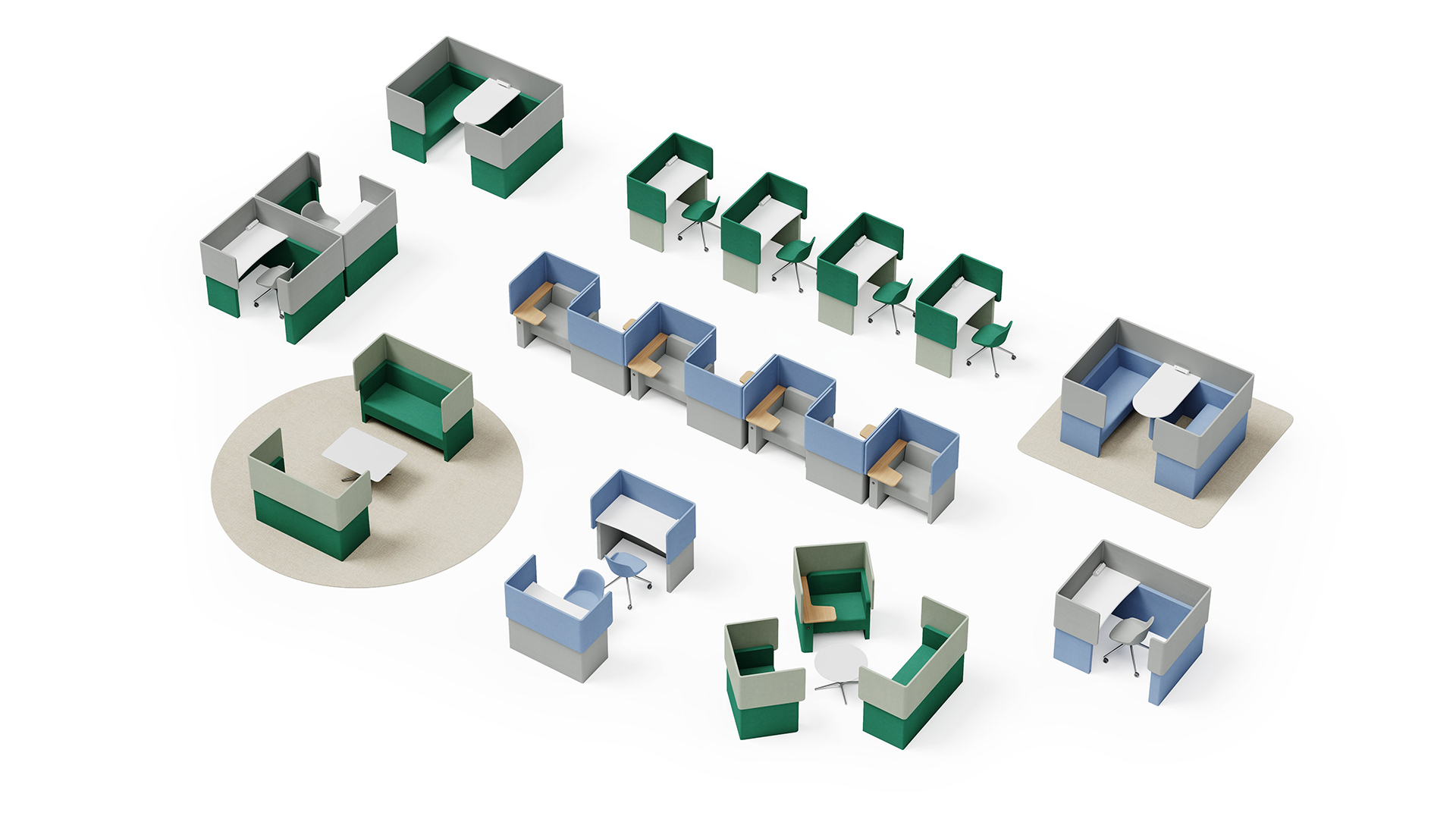 Fino系列以“私密·专注·柔性”为关键词,旨在为开放式空间中的个人或小团队创造一个“可移动的静音岛屿”。兼具隔音、功能性与色彩表达,为办公、学习与交流提供一个舒适避风港。涵盖单人位、双人位、面对面交流位、直角办公位、共享工作站等丰富组合,适配多种使用场景。
