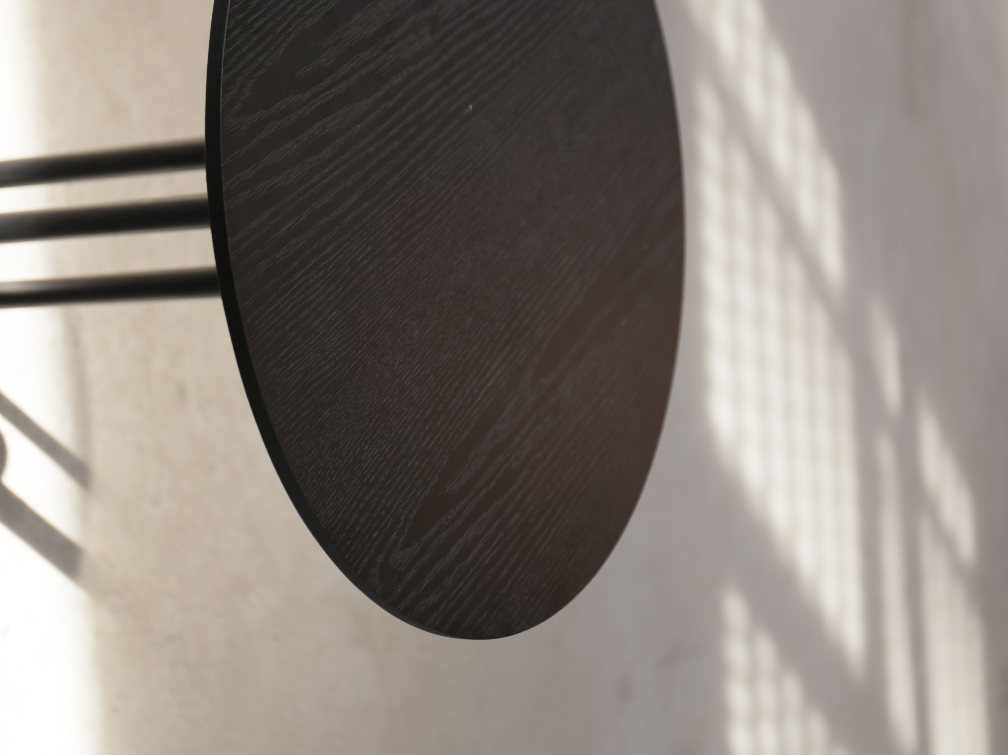 与普通餐桌不同,这是为餐厅空间设计的美感。提供方桌、圆桌和圆形咖啡桌版本。刷金属饰边赋予桌子一种光环感。