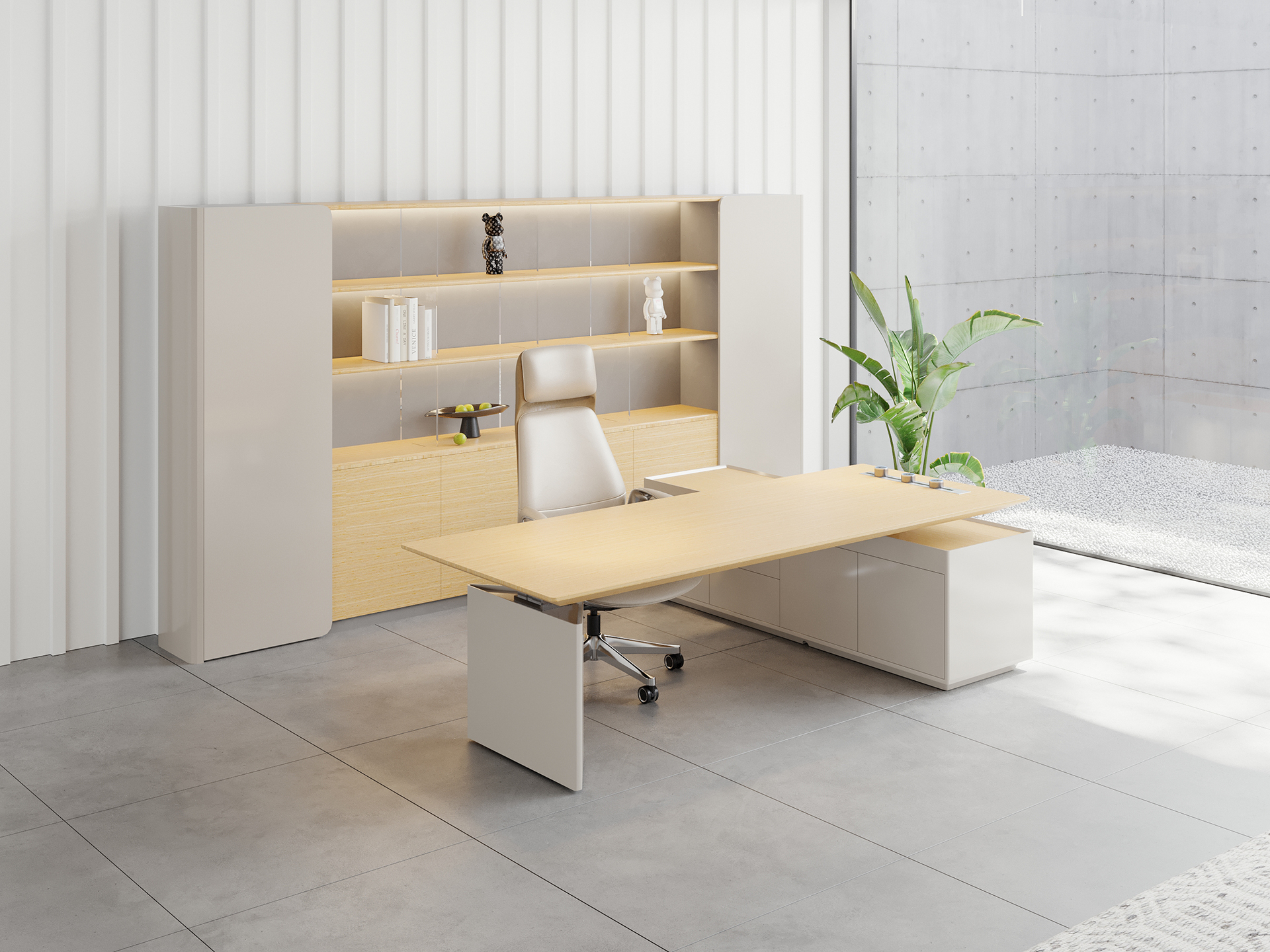 整体外观硬朗的线条和斜切边的设计充满科技感,73mm厚的台面通过斜边打磨使他沉稳而又时尚,金属横梁预埋在台底,同时将班台的电源线也收纳在台底,整体更加简洁清爽;